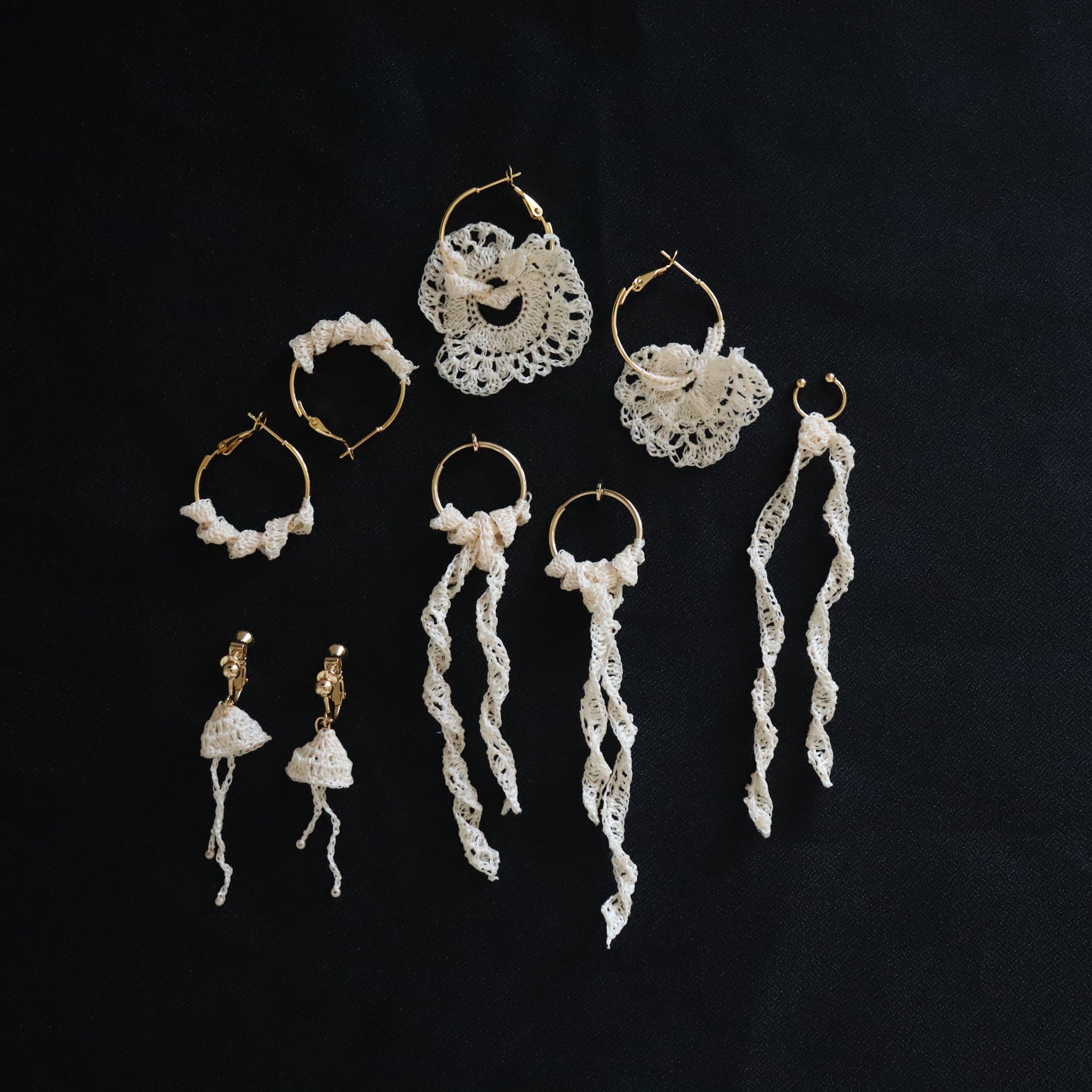 ――――――――――――――――――― ◻︎ 受注制作の耳飾り ― 柔らかなシルクレース ◻︎ ――――――――――――――――――― こちらは受注をいただいてから制作する作品です。 発送までにおよそ7日ほどお時間をいただいております。 イベント出店時は発送スケジュールが異なることもありますので、 恐れ入りますがプロフィールでご確認くださいませ。 ――――――――――――――――――― ◻︎ 素材・サイズ ◻︎ ・ワイルドシルク糸(染色なしの生成り色) ・16kgp(ゴールドメッキ) ・レース直径 約17mm(約2cm弱の小さめサイズ) ――――――――――――――――――― 自然のままの生成りシルク糸で編んだ、 繊細なレースモチーフの耳飾りです。 やわらかなサークル形に、ナチュラルなフリルを添え、 甘すぎず落ち着いた印象に仕上げました。 小さめのサイズ感なので、 大人の女性にも気軽につけていただけるデザインです。 今年のフェミニンファッションにもぴったり合います。 ――――――――――――――――――― 両耳で1グラム未満ととても軽く、 長時間つけていても耳が疲れにくいのが嬉しいポイント。 これからの暖かい季節のお出かけに、 そっと寄り添うアクセサリーとしておすすめです。 ――――――――――――――――――― ◻︎ ギフトにもどうぞ ◻︎ ギフトラッピングも承っております。 当店の商品ページより、 ギフトボックスでのラッピングをお選びいただけますので、 贈り物にもぜひご利用ください。 ――――――――――――――――――― シルク/レース/フリル/レース編み/かぎ針編み/ ナチュラル/自然/生成り/小ぶり/プチ/丸/輪/羽根/ 繊細/華奢/上品/エクリュ/キナリ/ギフト/ 大人可愛い/プレゼント