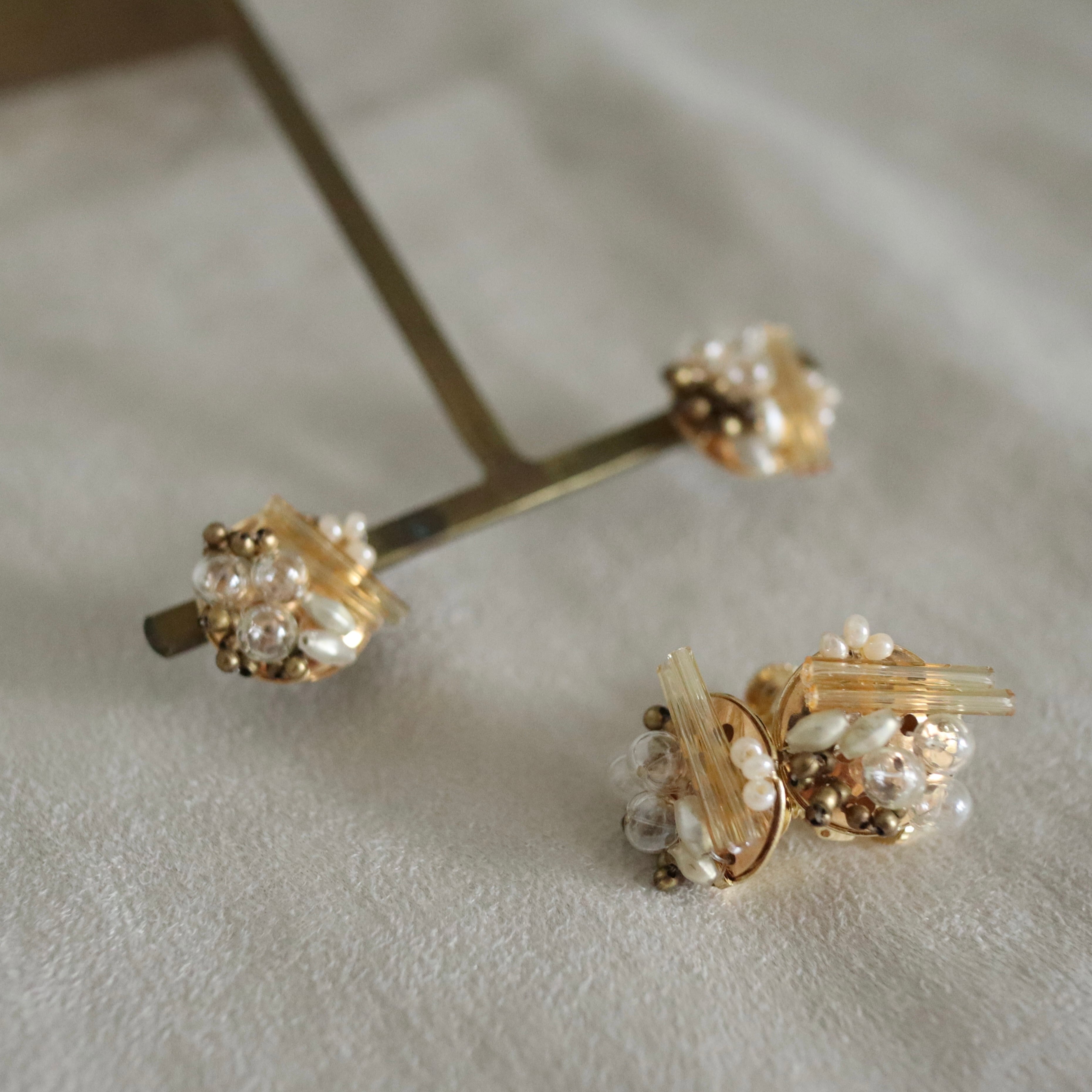 ● 使用素材 : フランスアンティークビーズ、 フランスヴィンテージビーズ ピアス(チタンポスト)イヤリング(金メッキ) ● サイズ : 20mm×13mm ・・・・・・・・・・ [ nuts ] ブラウンを基調としたこっくりと深みのあるカラー イエローゴールドやクリアなスフレビーズを用いて クリスマスらしい温かみのあるデザインに仕上げました。 もちろんクリスマス以降にも 主に暖色カラーのお召し物が多い方には 合わせやすいアイテムかなと思います。 フランスで100年以上前につくられていた さまざまな形のスフレビーズを仕入れ、 ミックスさせた唯一無二のアクセサリー ローストしたナッツのようなほろ苦さと アンティークらしいほんのりとした優しさは、 大切な方へのプレゼントにもおすすめです◎ ・・・・・・・・・・ ● ギフトラッピング承ります 当店商品ページにもあげております、 ギフトボックスでのラッピングを選択できます。 ご希望の方はタブよりお選びくださいませ。 ・・・・・・・・・・ ゴールド、式、オケージョン、可愛い、大人、洗練、抜け感、プレゼント、ギフトラッピング、アンティーク、ヴィンテージ、ブラウン、茶、ベージュ、雪、ゴールド、イエベ、ナチュラル、スタッズ、ポイント、揺れない、金具変更可、イヤリング