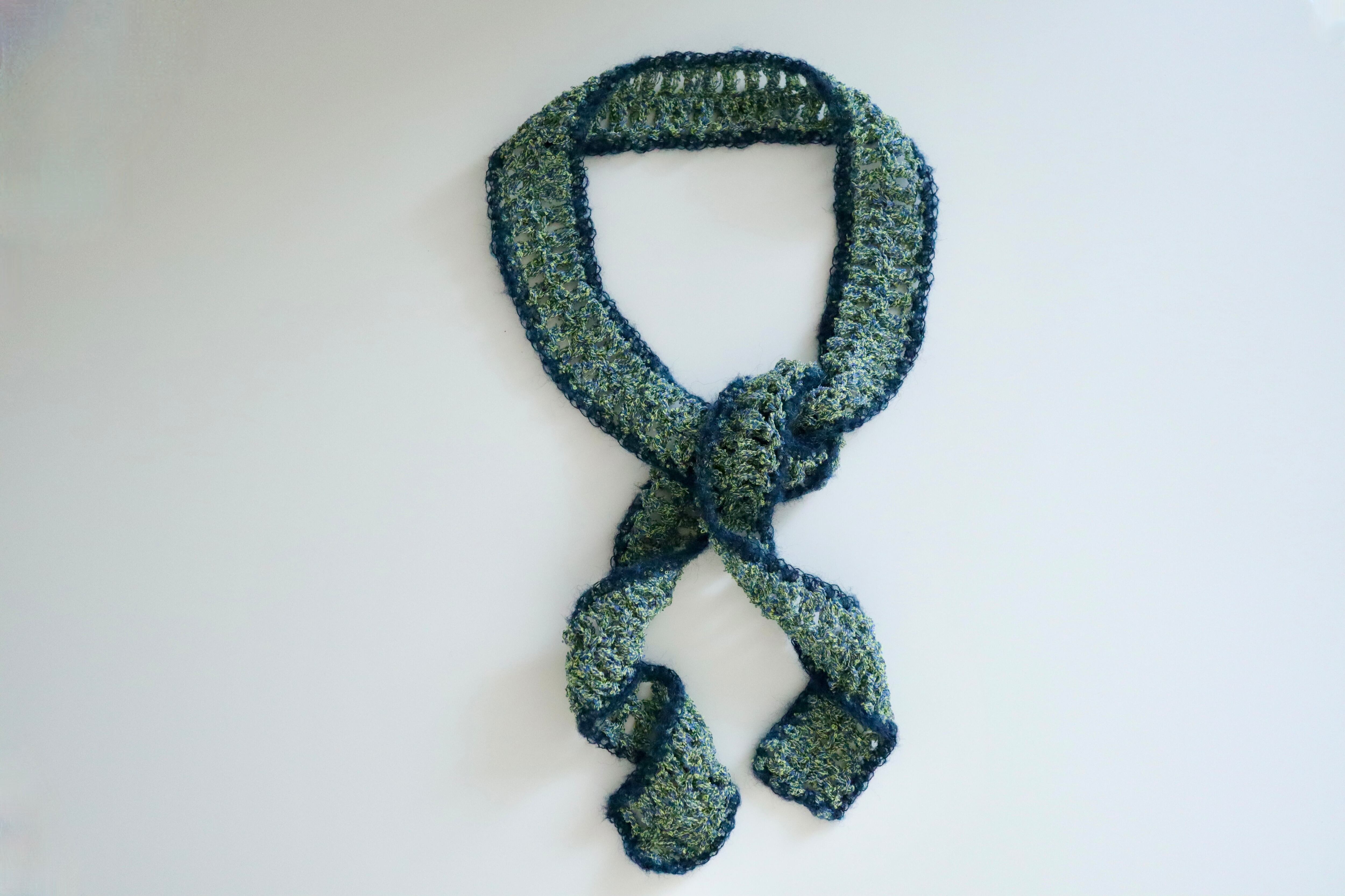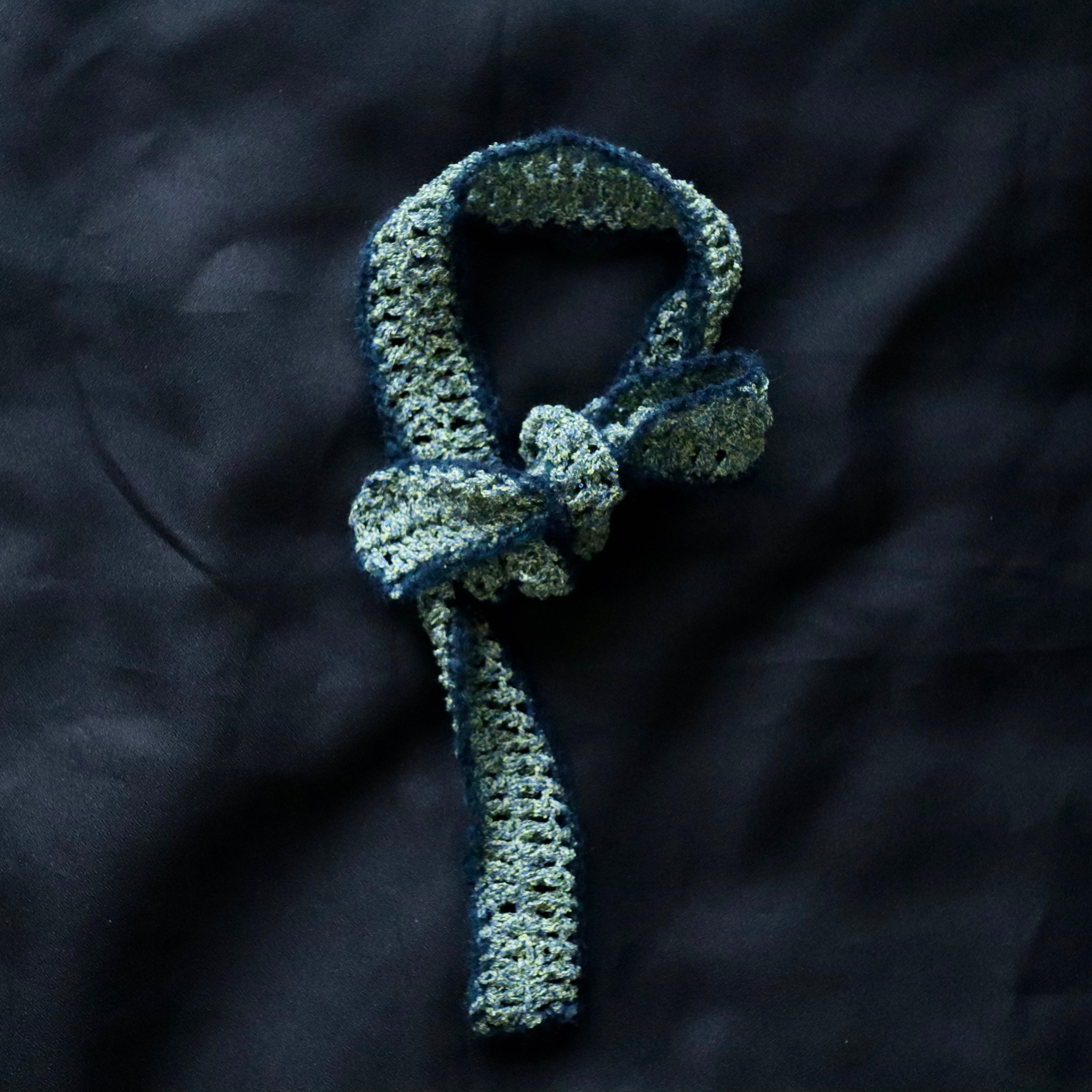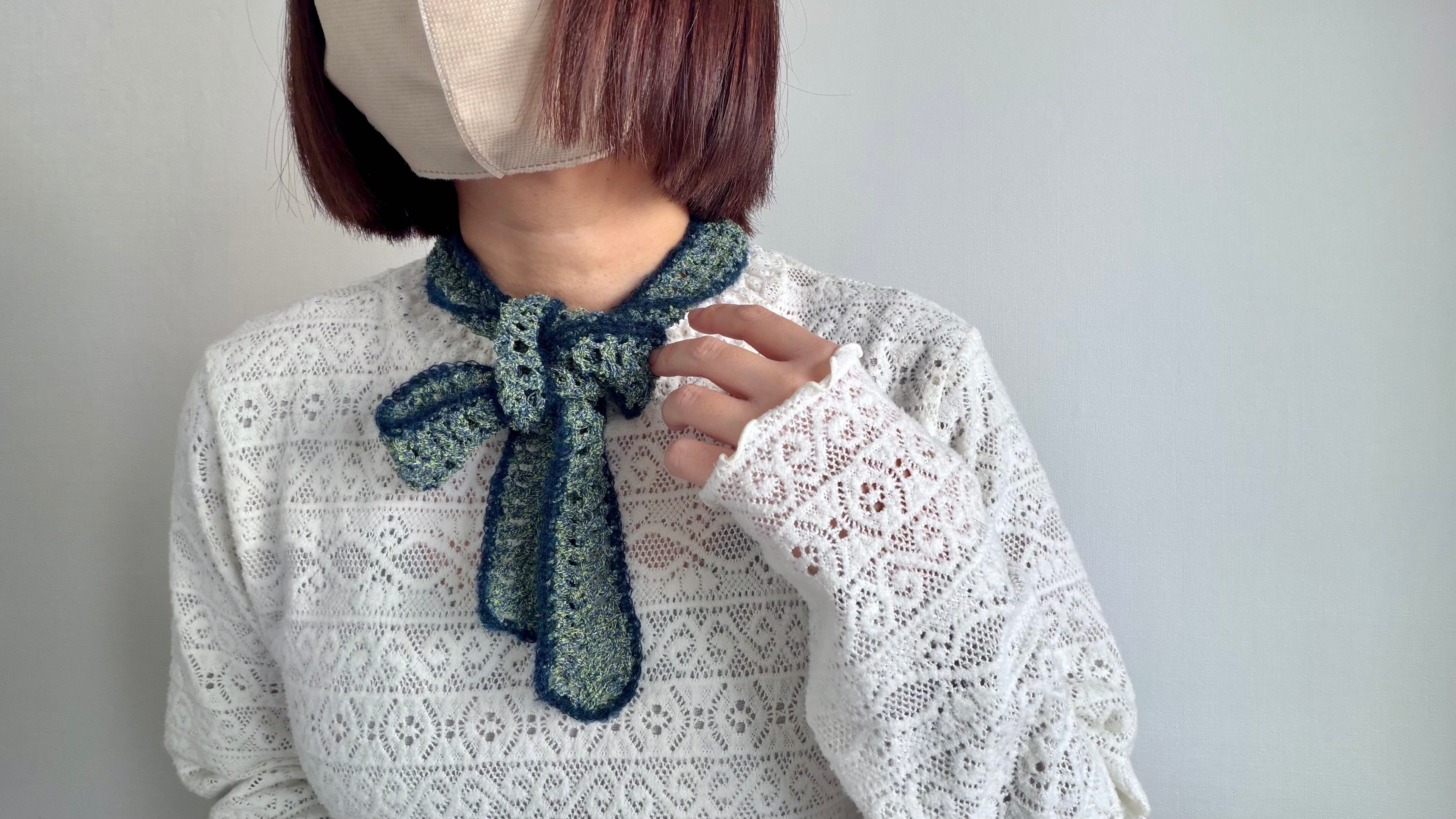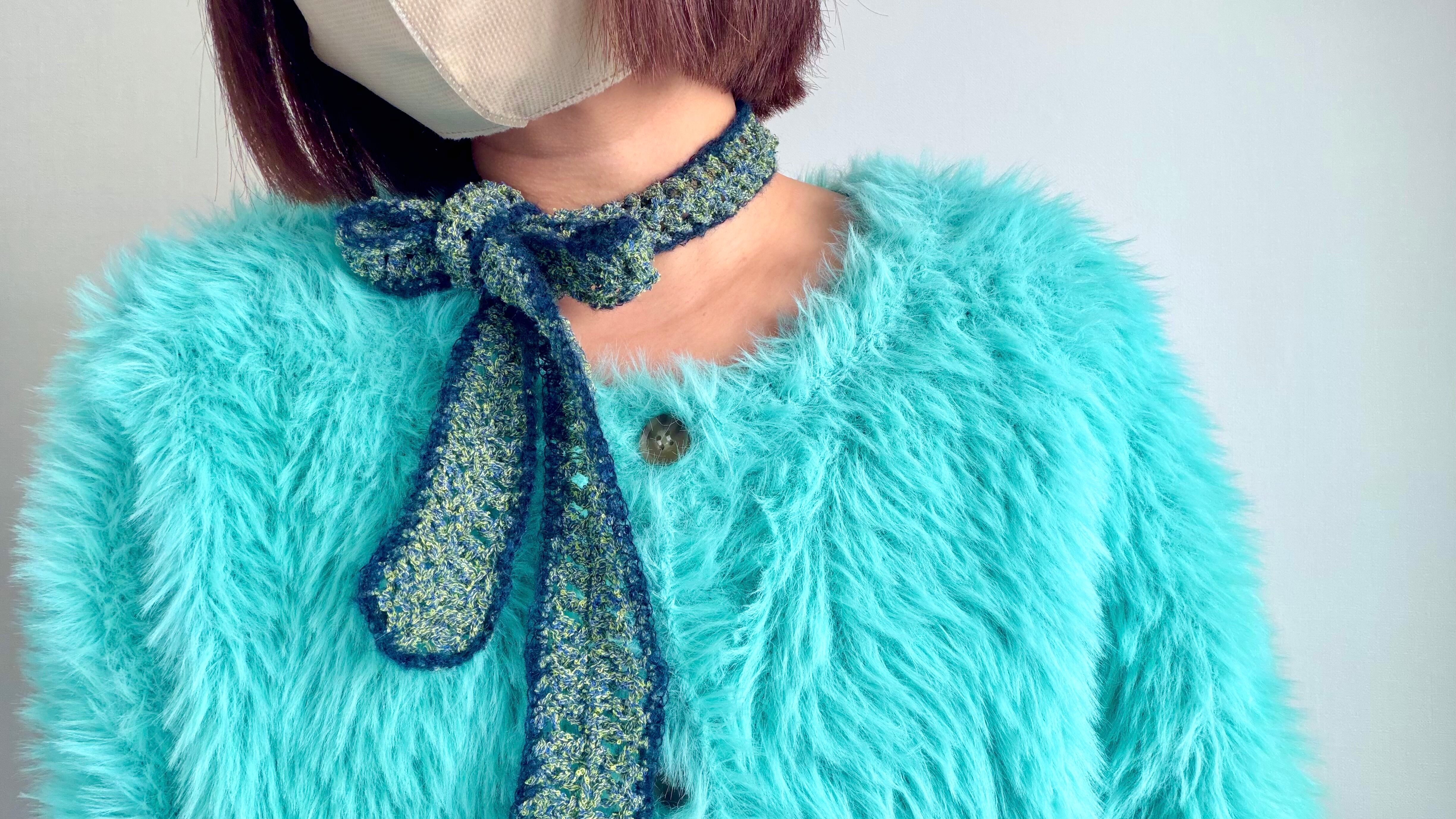 毛糸、ふわふわ、グリーン、植物、ハーブ、爽やか、ネイビー、ブルー、かわいい、スカーフ、首、プレゼント、ニット、タイ、リボン、パイピング、バイカラー、個性的、ロマンティック