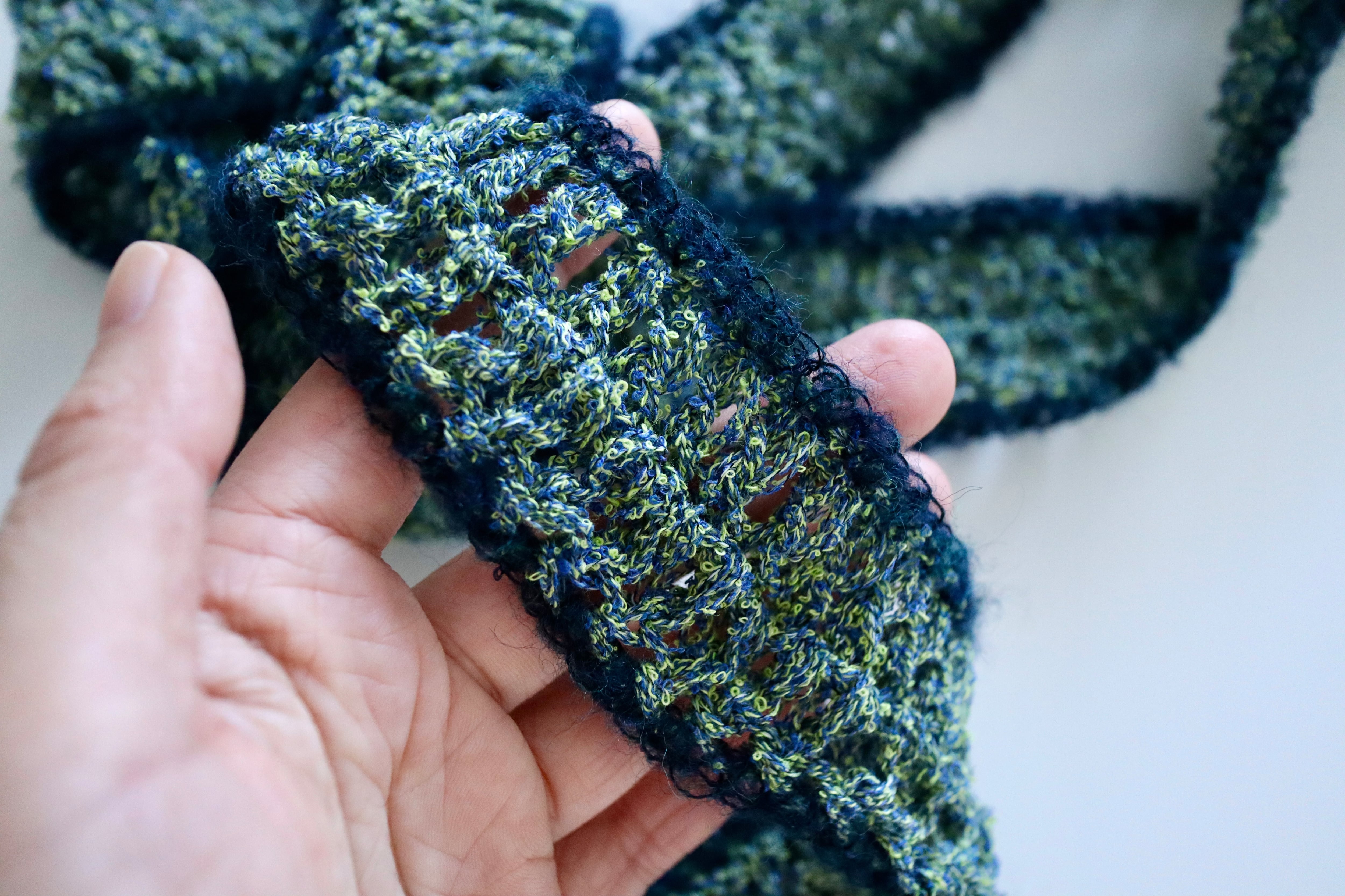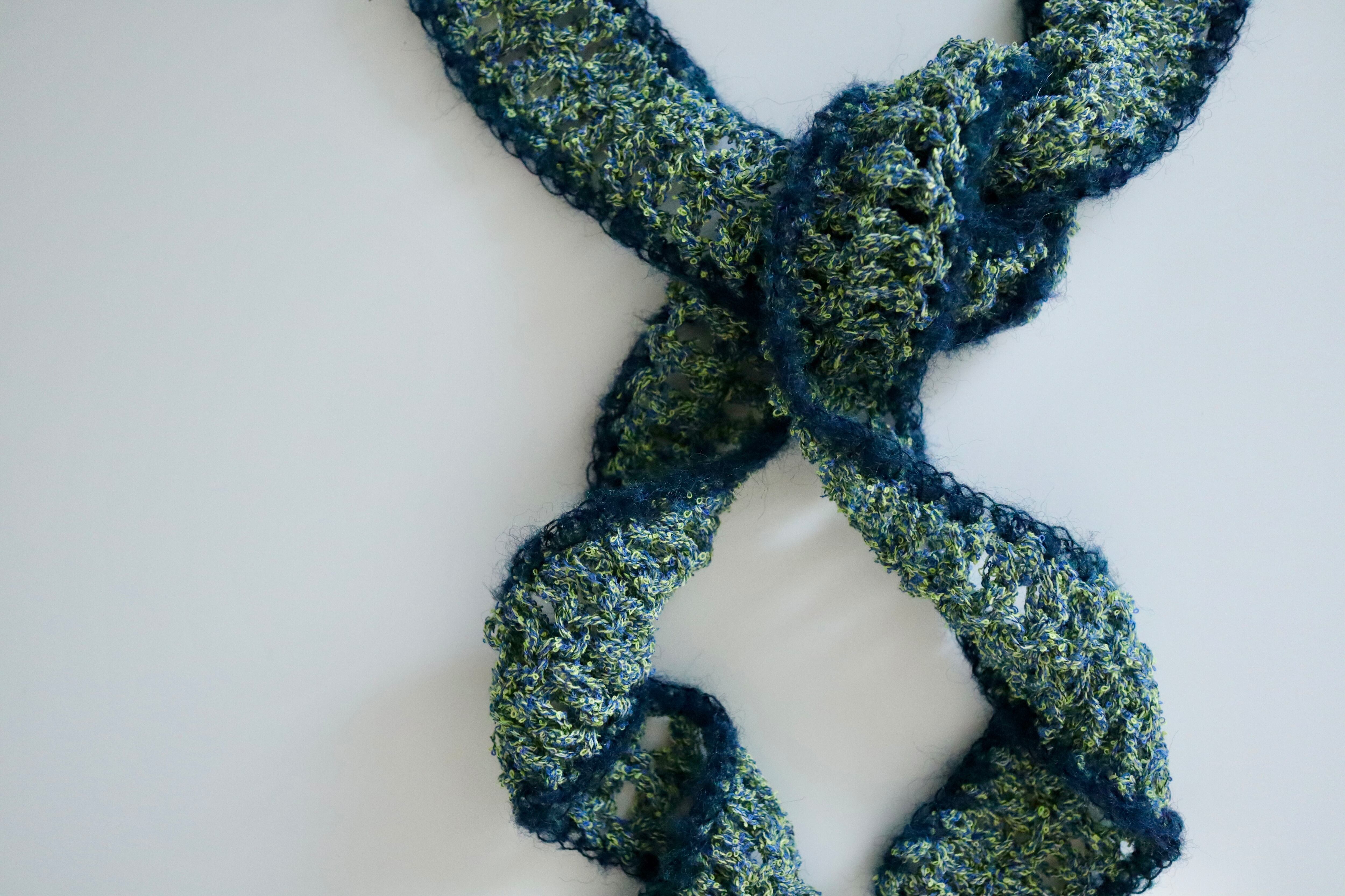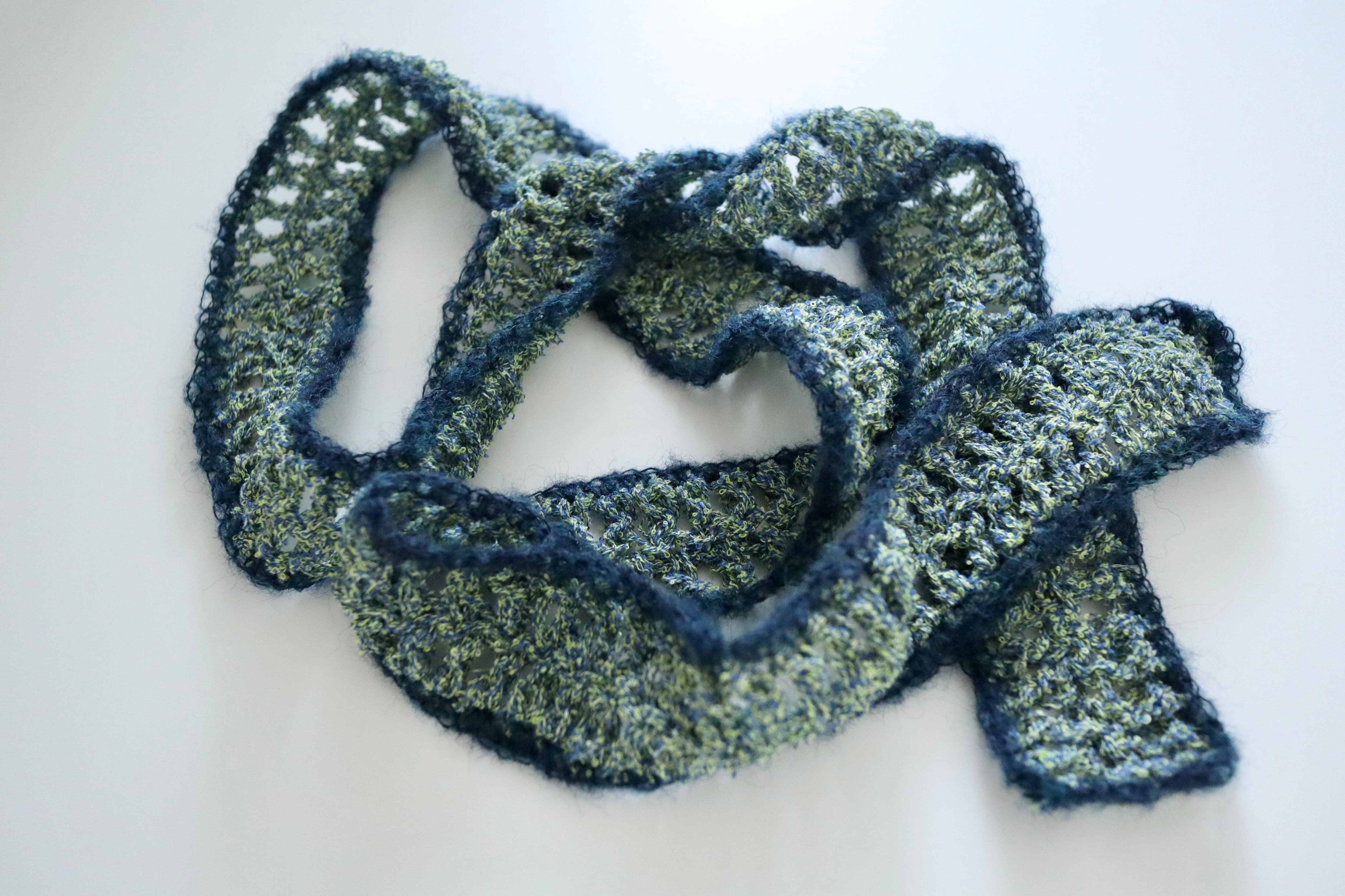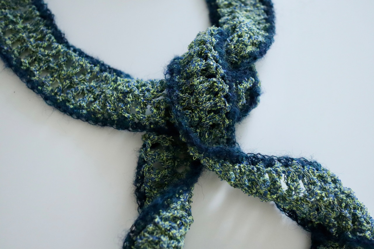 毛糸、ふわふわ、グリーン、植物、ハーブ、爽やか、ネイビー、ブルー、かわいい、スカーフ、首、プレゼント、ニット、タイ、リボン、パイピング、バイカラー、個性的、ロマンティック