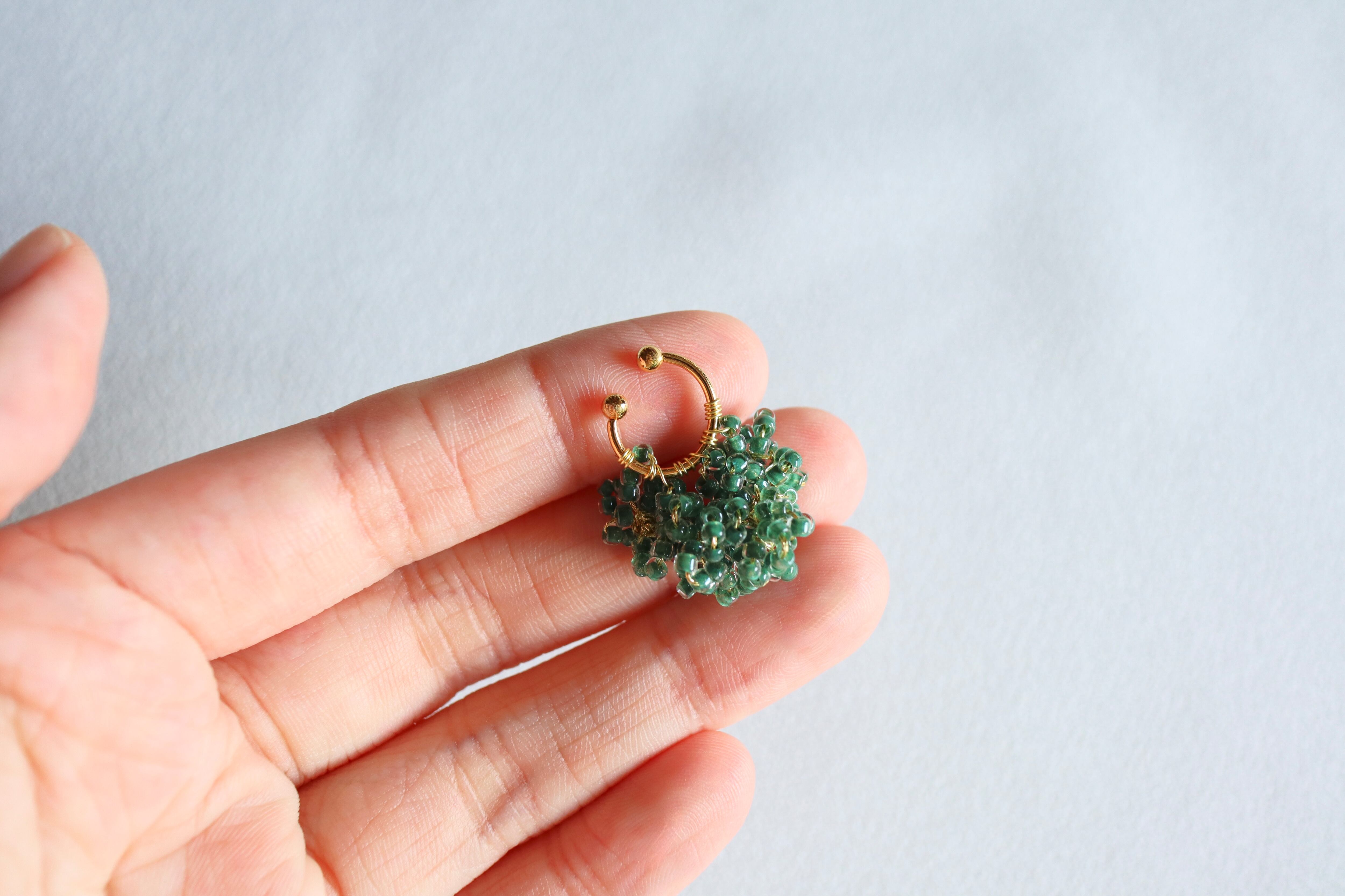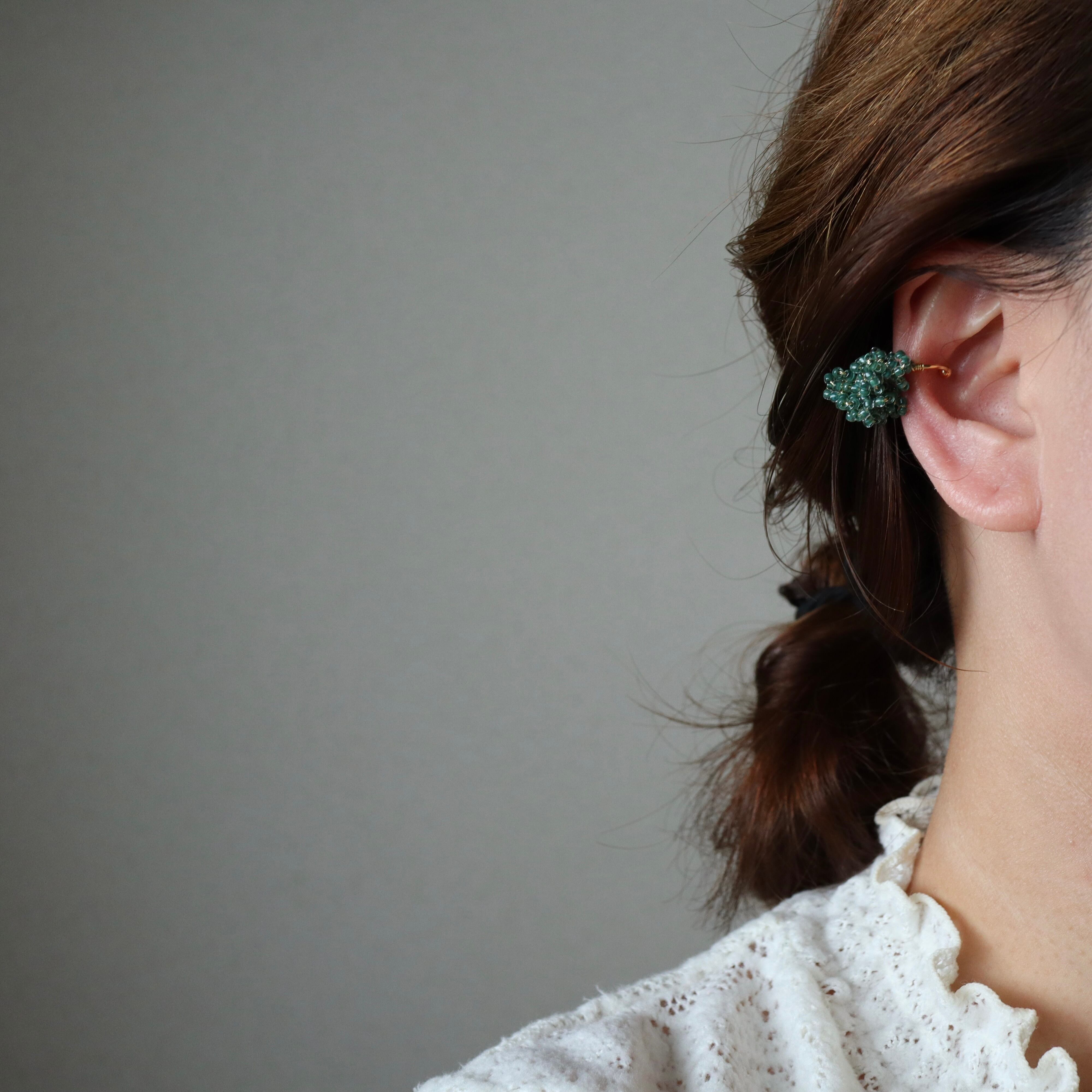 一点もの、イヤーカフ、ビーズ、ヴィンテージ、グリーン、深緑、forest、手編み、クロッシェ、上品、アンティーク、個性的、ナチュラル、おしゃれ、重ね付け、大人のアクセサリー、プレゼント、特別なアクセサリー