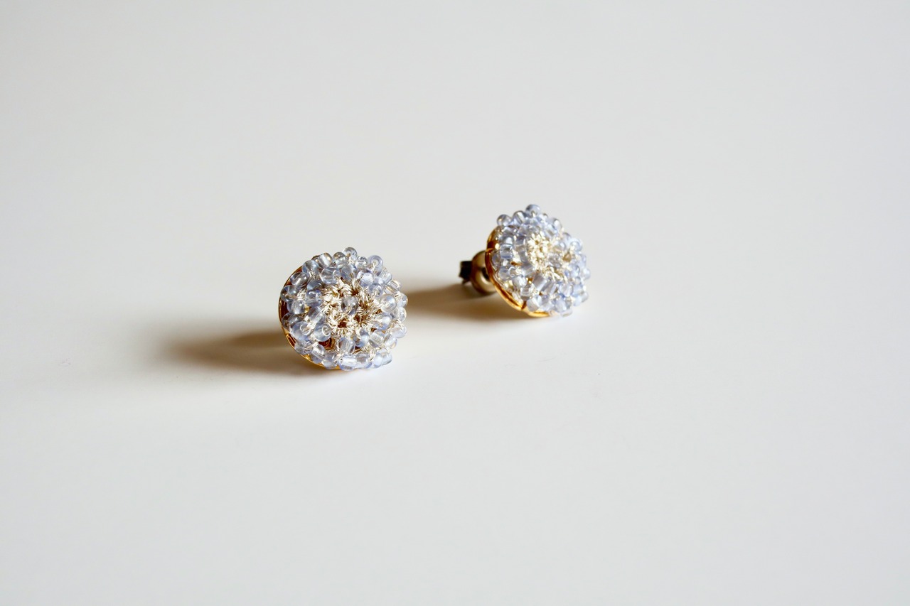 ゴールド、華やか、可愛い、小さめ、小粒、プチ、揺れない、スタッズ、小さい、さりげない、フェミニン、花、フラワー、プレゼント、ギフト、ブルー、青、blue、氷、透け感、透明感、繊細、華奢、上品、センセーショナル