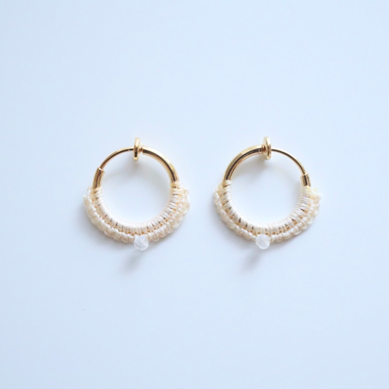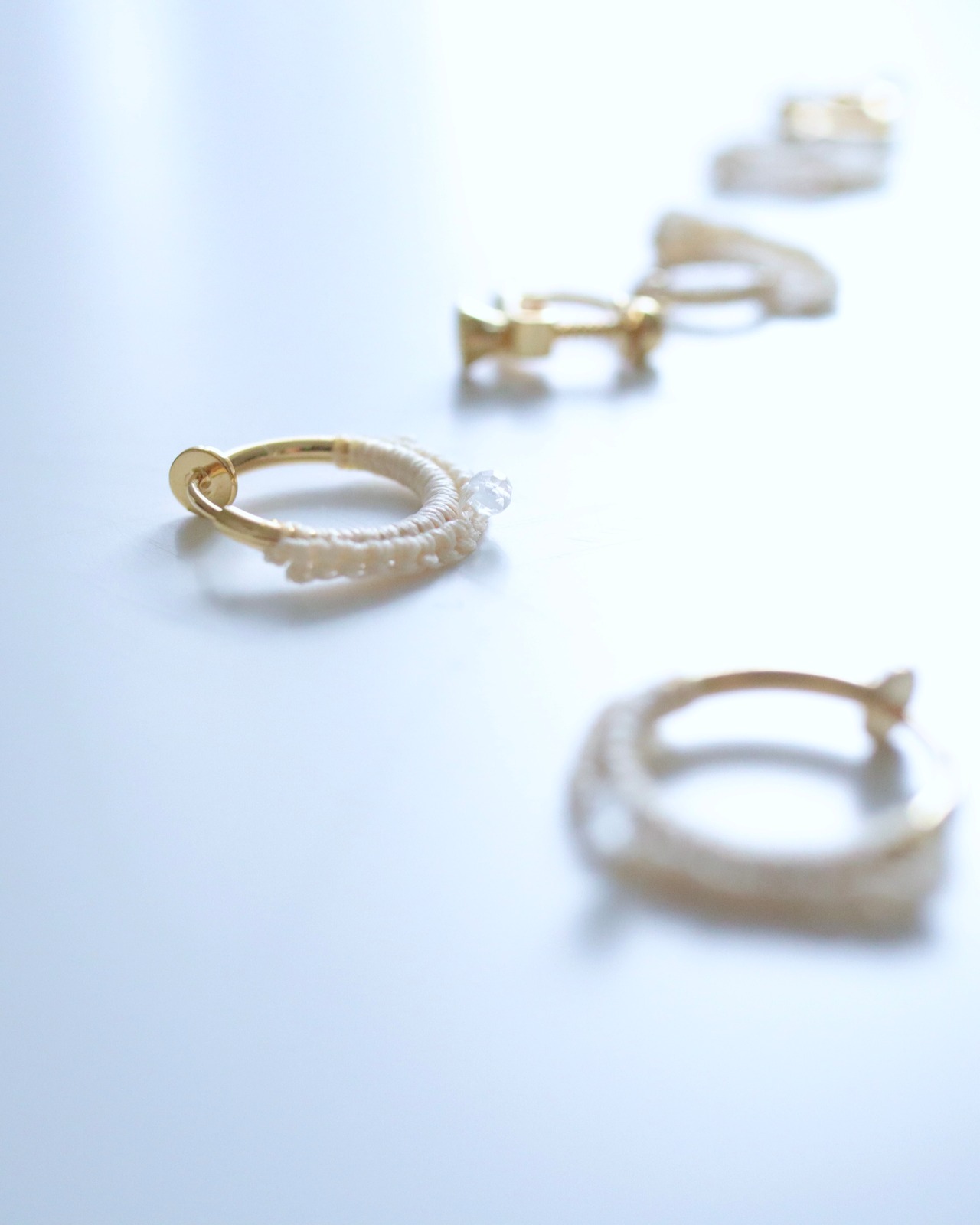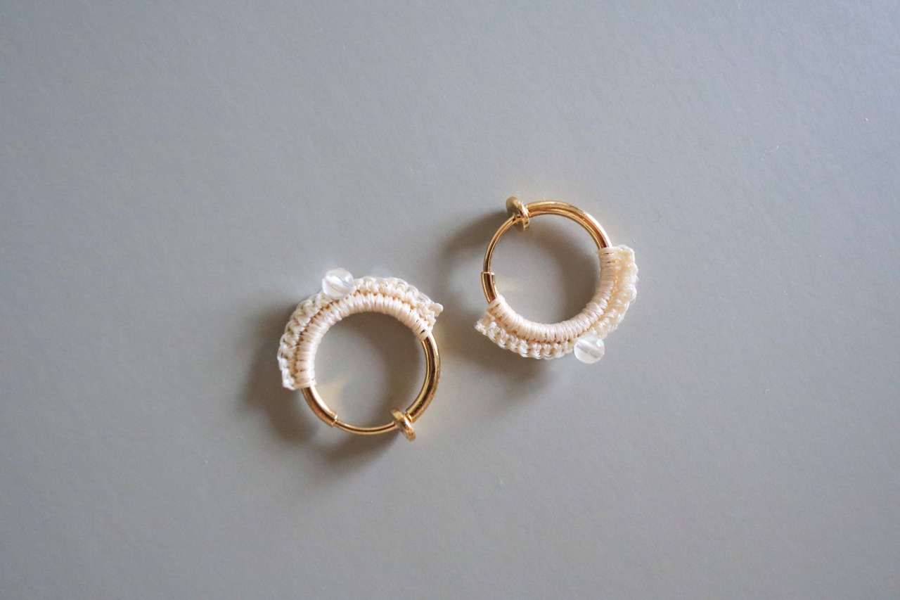 イヤリング、フープ、ゴールド、キナリ、エクリュ、アイボリー、ベージュ、大人、シルク糸、絹糸、国産、日本製、上品、繊細、レース、フリル、プレゼント、ギフト、ナチュラル、自然、軽量、水晶、天然石、クリスタル、透明感、透け感、華奢