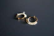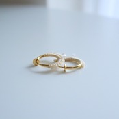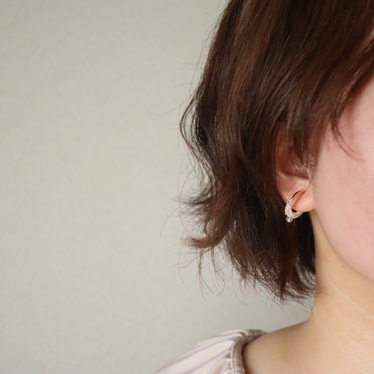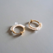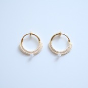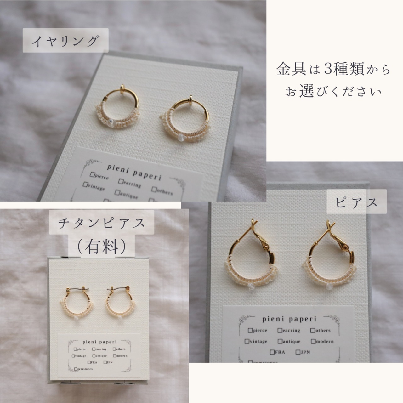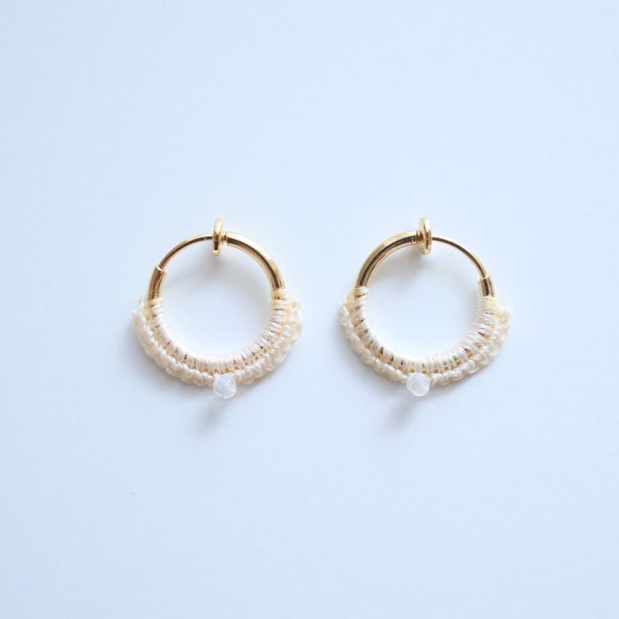 イヤリング、フープ、ゴールド、キナリ、エクリュ、アイボリー、ベージュ、大人、シルク糸、絹糸、国産、日本製、上品、繊細、レース、フリル、プレゼント、ギフト、ナチュラル、自然、軽量、水晶、天然石、クリスタル、透明感、透け感、華奢