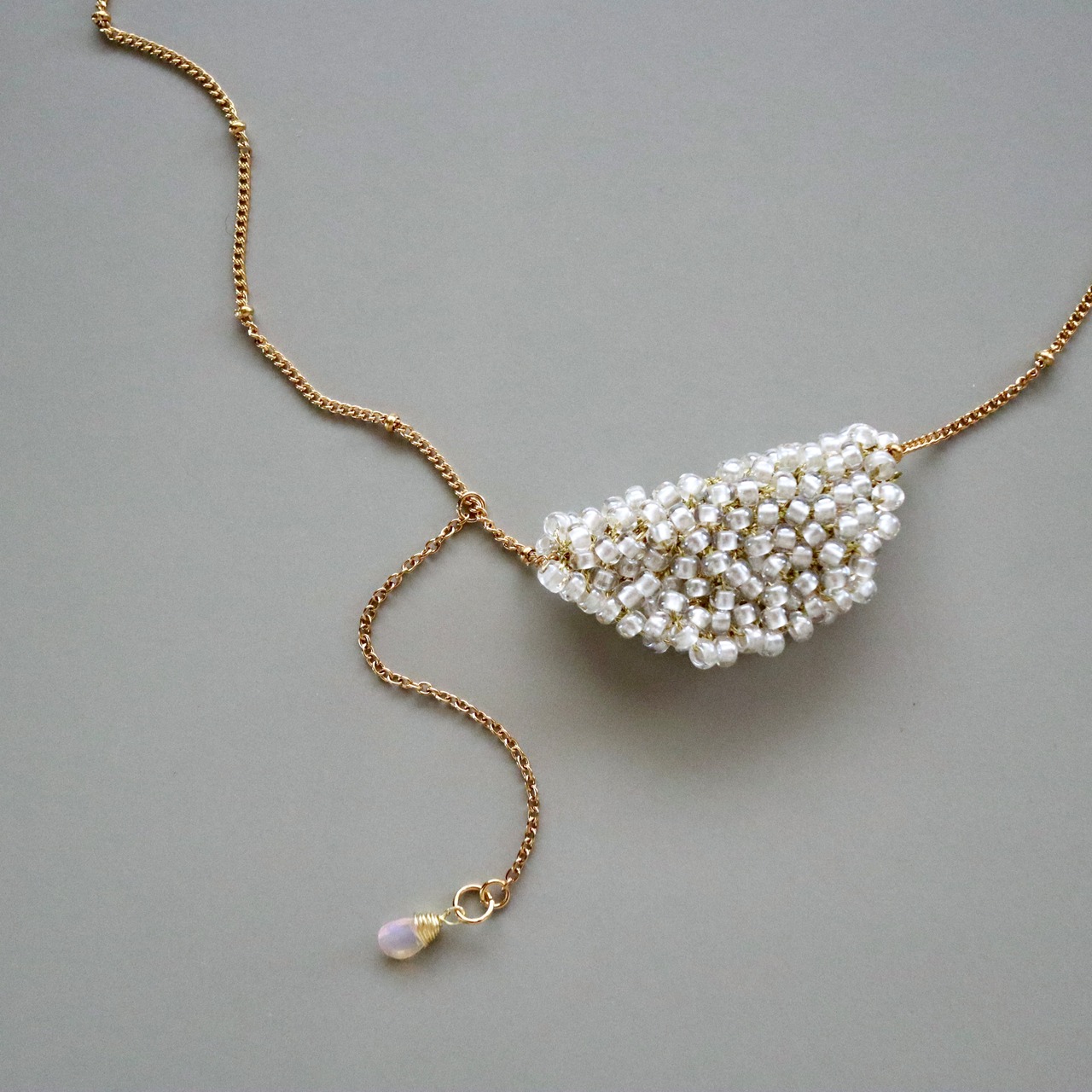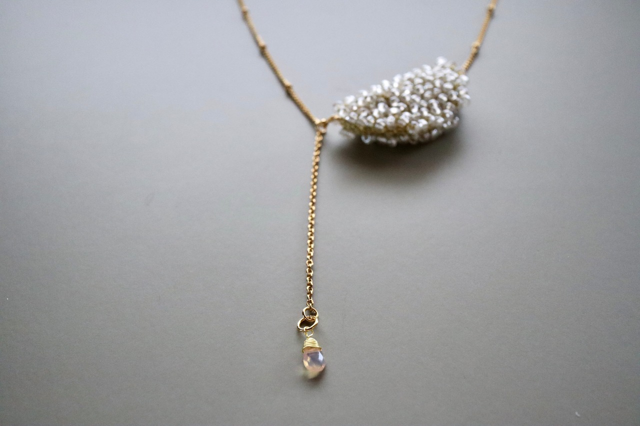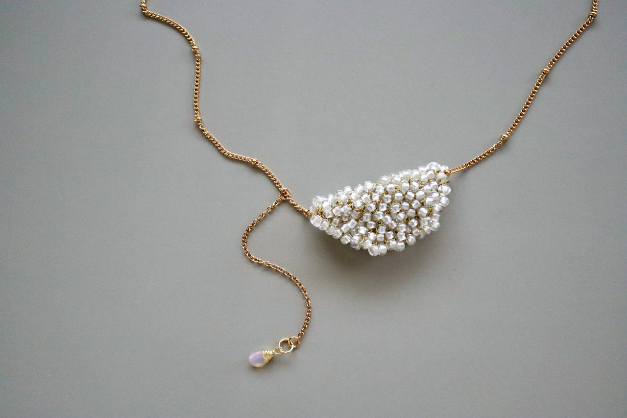 ネックレス、コンテンポラリー、一点もの、ニュアンス、月、白、ホワイト、透け感、透明感、ゴールド、ピンク、個性的、人と被らない、上品、高品質、大ぶり、華やか、プレゼント、ギフト、贈り物