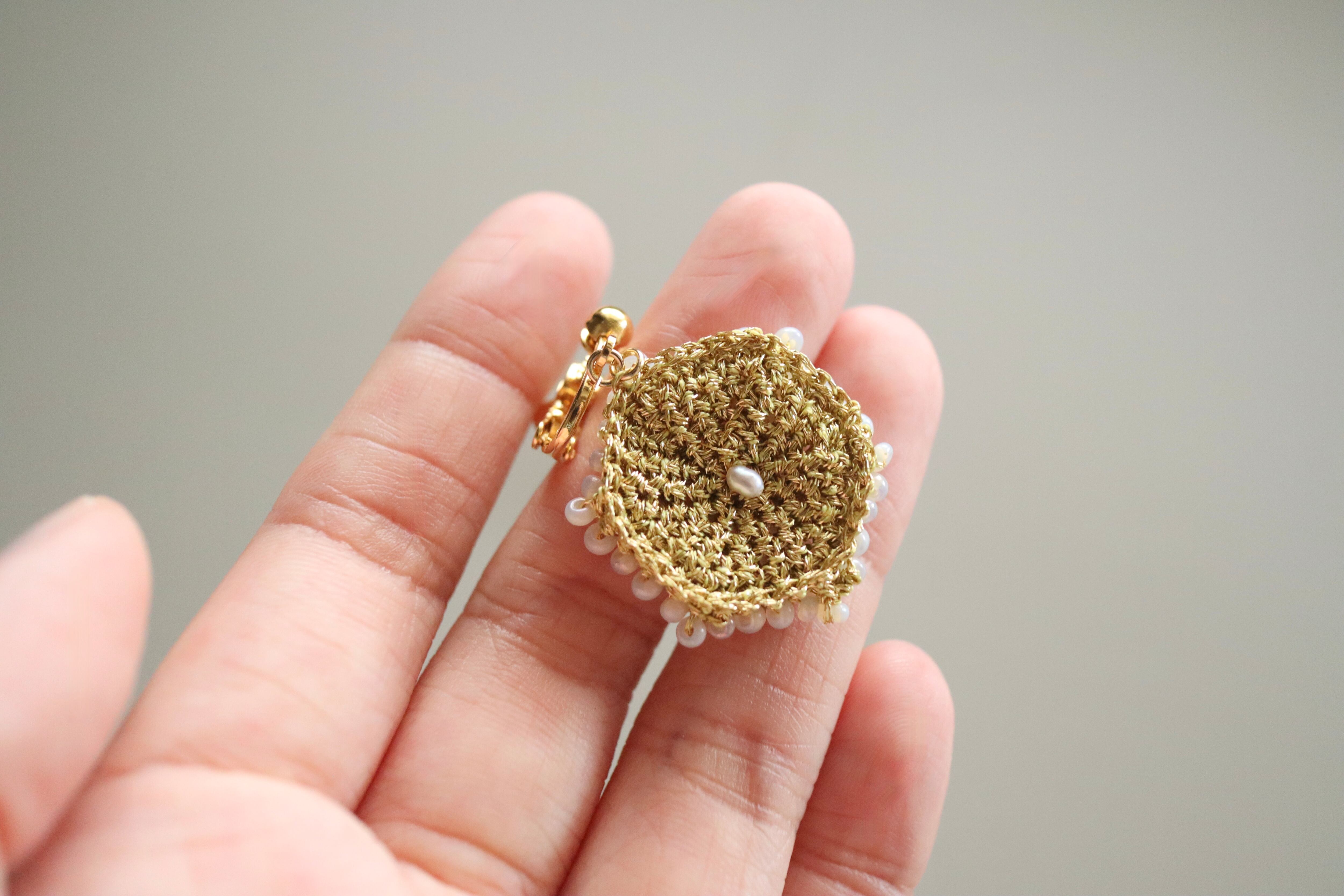 スター、星、star、大ぶり、キラキラ、華やか、可愛い、大人かわいい、白、アイボリー、ゴールド、パール、真珠、レース編み、かぎ針編み、、イヤリング変更可能、ピアス、ギフト、ラッピング、プレゼント