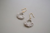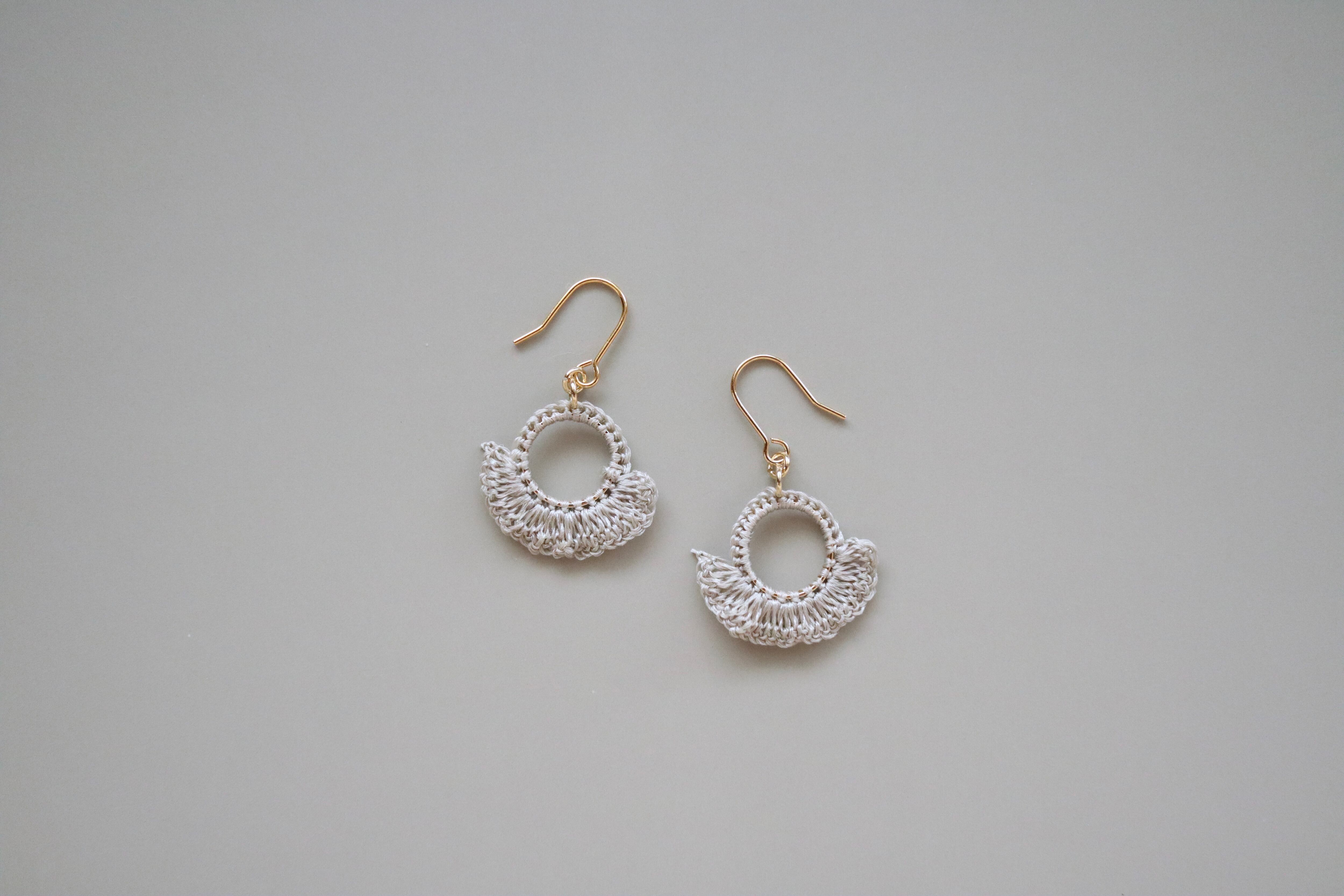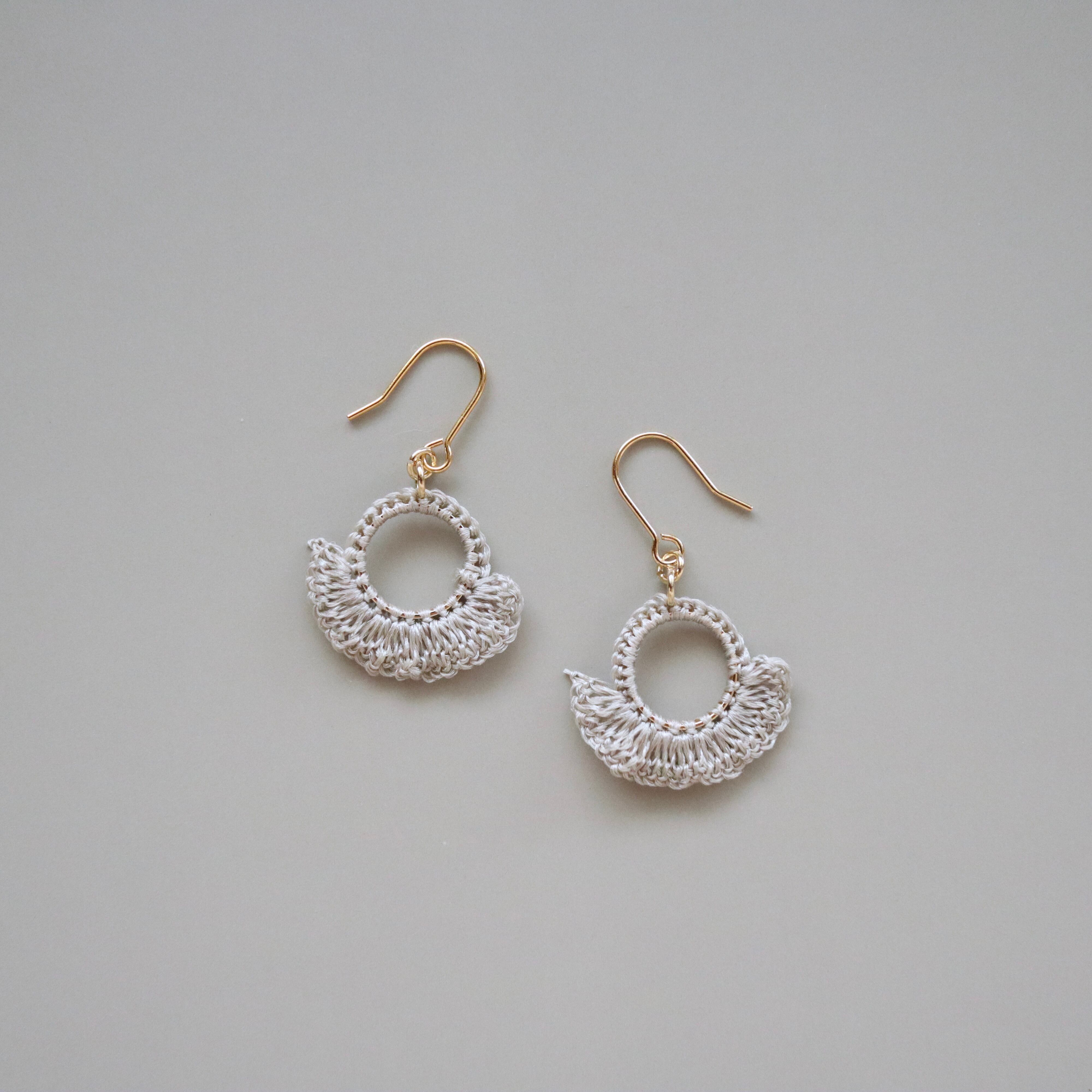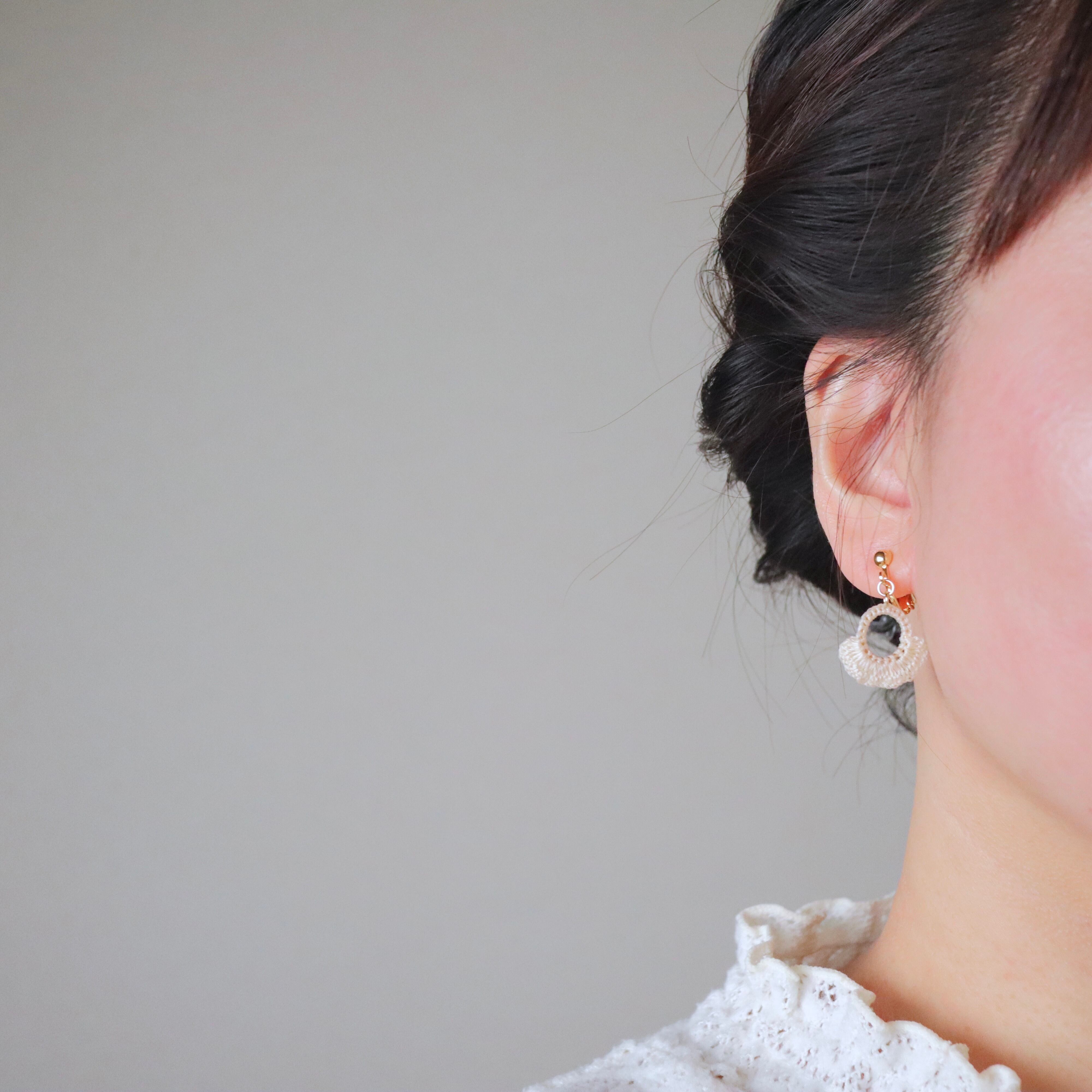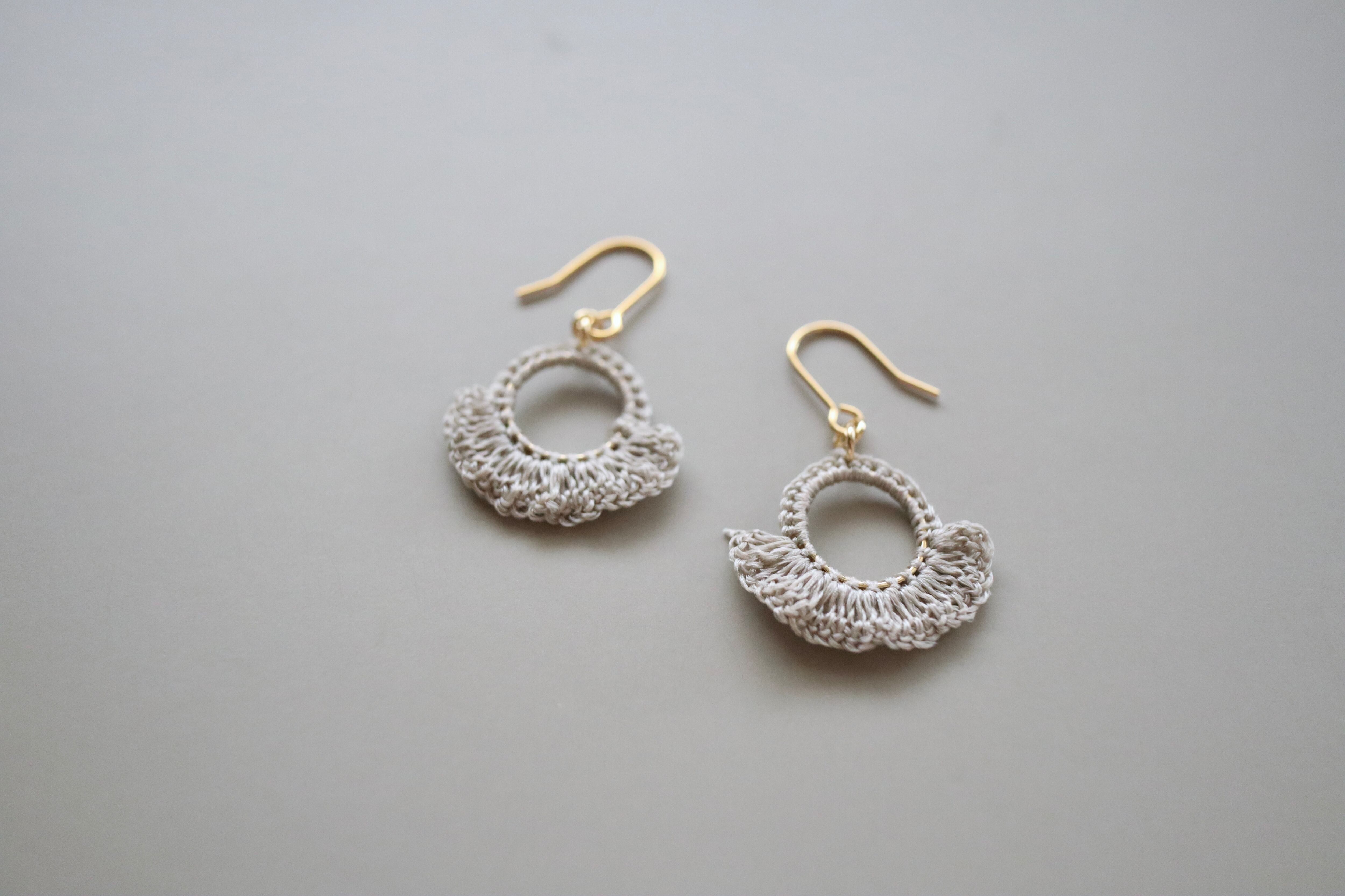 銀鼠色のシルク糸で編んだ繊細なレースモチーフの耳飾りです。