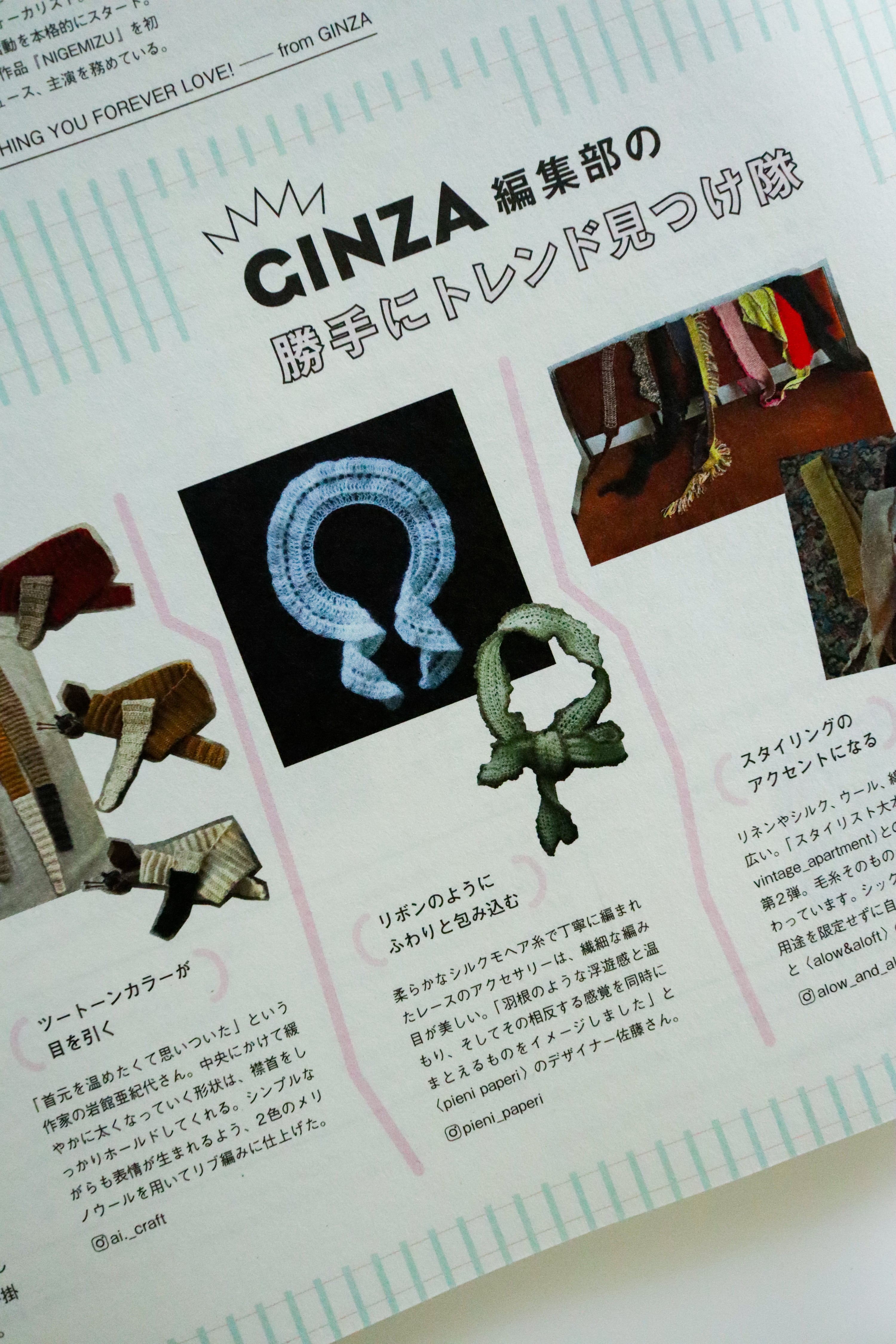 GINZA3月号(2026年2月12日発売)『勝手にトレンド見つけ隊』のコーナーにてpieni paperiのニットスカーフ○ frill mohair tippet○ Choco Rim knit scarfが掲載されました。