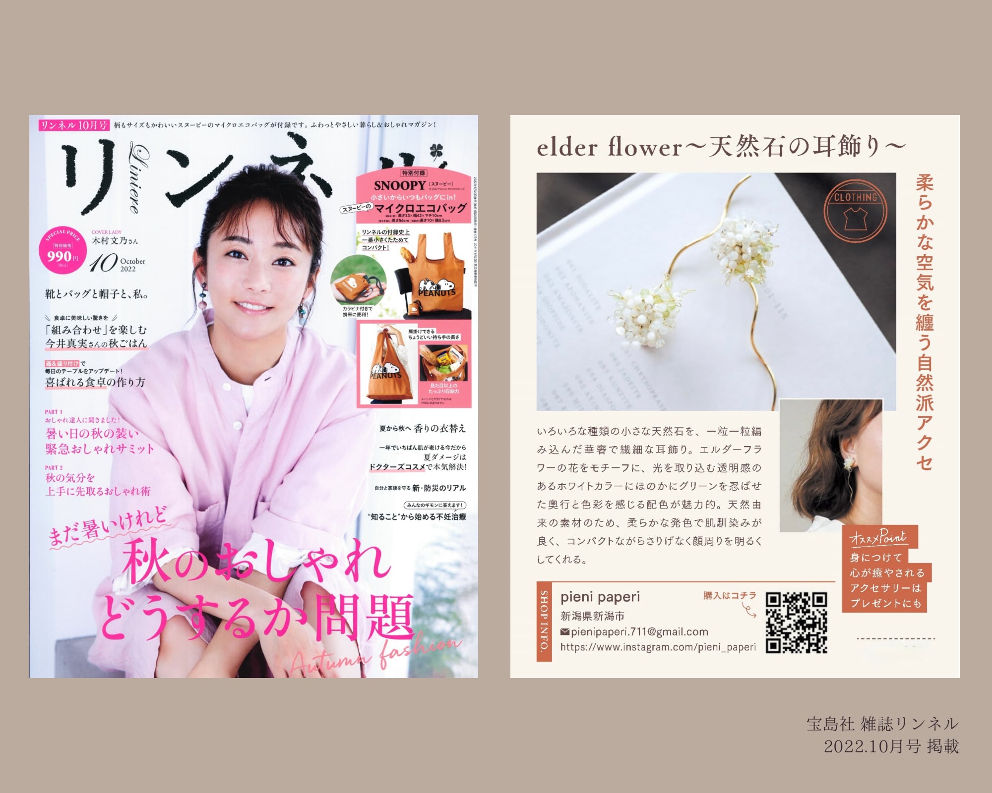 女性ファッション誌リンネル10月号(2022年8月20日発売)『衣食住のライフスタイルグッズセレクション』当店の【elder flower 天然石の耳飾り】が掲載されました。